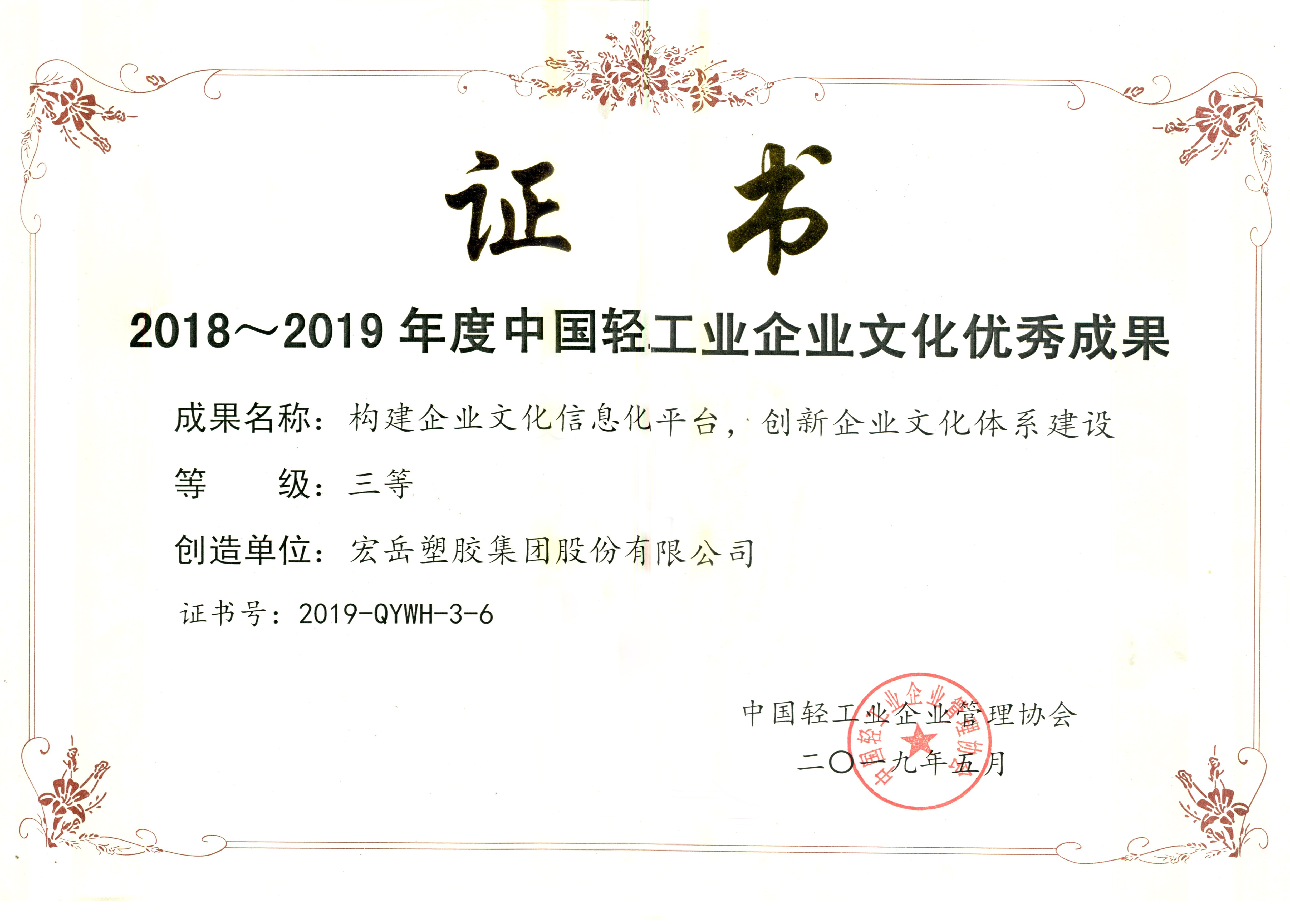 5月17日,中国轻工业企业管理协会第四届第五次理事(扩大)会议暨2019年轻工业企业文化建设经验交流会在郑州召开,好博体育集团申报的“构建企业文化信息化平台,创新企业文化体系建设”项目成果荣获2018~2019年度中国轻工行业企业文化优秀成果三等奖。
