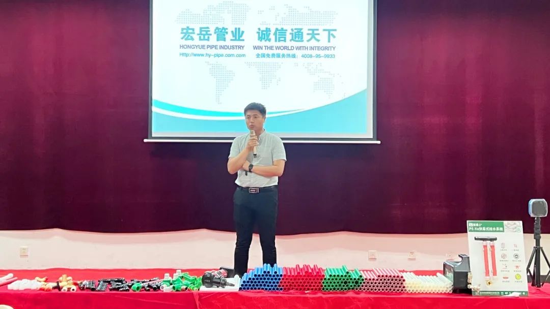 好博体育1+区域运营经理向各位参会者介绍了好博体育塑胶集团概况,并着重讲解了好博体育1+产品体系及PE-Xa快易连接管道系统,凭借其简单、快捷、安全的产品及连接优势,得到了与会水电技师们的高度好评。